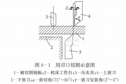 放樣和劃線之后就是下料。采用機械剪切下料是工業生產中最廣泛采用的方法。常用的機械剪切下料多采用圓盤剪和龍門剪板機,而以龍門剪板機的應用最為廣泛,但通常只能做直線剪切,剪切長度也受到機床跨距的限制,一般最大剪切長度為2 000^-2 500 mm,厚度為32 mm。如圖9一1所示.把需要剪切的鋼板放在兩把剪刀之間,當上剪刀切人鋼板1/4-1/3厚度時,鋼板上所受剪力超過其抗剪強度而被剪斷。