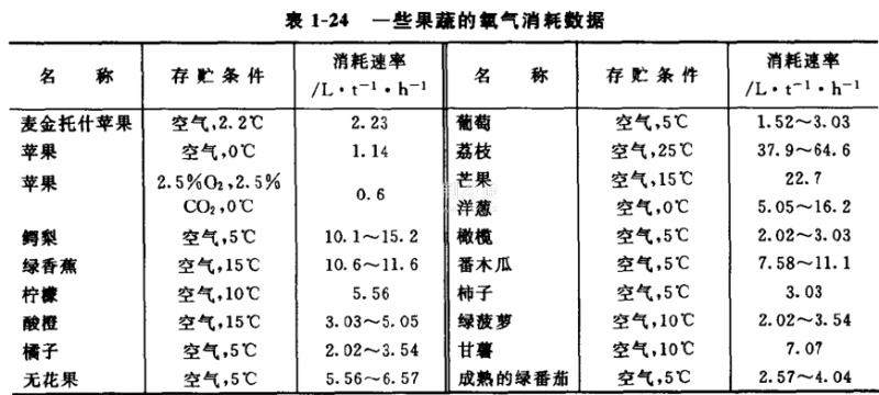 氣調保鮮有CA與MA兩種方式。CA是指在進行氣調貯藏保鮮過程中,貯藏環境中的氣體成分與濃度以及溫度與濕度是由人工進行調節的,并保持穩定,為實現這種特殊的貯藏保鮮環境采用的設備是氣調庫以及相關的配套設施,而MA被稱為自發氣調保鮮或限氣貯藏保鮮。一般是將被保鮮的產品密封在具有一定透氣、透濕功能材料的包裝袋或容器內,通過產品自身的呼吸作用,不斷地消耗O?、釋放CO?,使包裝容器中O?濃度降低, CO?濃度增高,從而形成比較適宜的氣體組分貯藏環境,達到保鮮的目的。但認和CO?的濃度變動比較大,多用于短期貯藏保鮮、運輸以及銷售時的臨時性保鮮。表1-24為一些果蔬在貯藏保鮮中消耗O?的數據。
