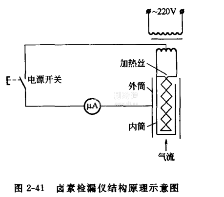 管內的內筒、外筒及加熱絲均由鉑制成。內筒被熱絲加熱后發射正離子,外筒收集正離子,離子流的大小經放大后由微安計(5A)指示,同時輔以音響及紅色燈光作為泄漏報警。加熱電源可用直流或交流。