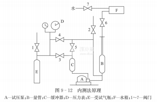 水壓試驗容積殘余變形多采用內測法測定,然后通過計算求出其殘余變形率,內測法求取水壓試驗容積殘余變形率的原理見圖9一12。