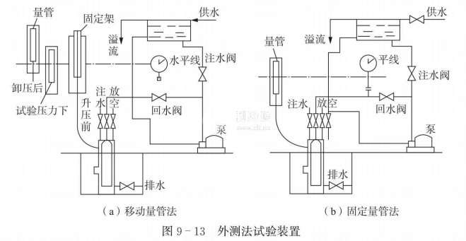 外測法又稱“浸水法”,是將壓力容器浸入特制的密閉水槽中進行試驗,在試驗壓力下測量容器由于膨脹而從水槽中排出的水量,即為該容器的容積全變形值ΔV。再測量泄壓后的回水剩余量,即為該容器的容積殘余變形值△V'。通過公式可計算出該容器的容積殘余變形率ε。此種方法不受試驗系統中殘留氣體的影響,不必考慮水的壓縮量,因此計算方便,誤差易校正,準確性高,但操作復雜,不易發現容器泄漏。外測法實驗裝置分為移動量管法、固定址管法和稱量法三種類型,見圖9一13。