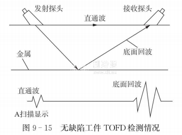 圖9一15是無缺陷工件TOFD檢測情況,A掃描圖中只有直通波和底面反射波信號波形。當波束從高阻抗介質中人射到低阻抗介質(例如,從鋼中人射到鋼/水界面或鋼/水界面反射到鋼中,在經過界面反射后變成以負向周期開始傳播、在碰到界面之前是以正向周期開始傳播)時,在界面反射的信號相位改變180°,波速在碰到界面之前是以正向周期開始傳播的,在經過界面反射后變成以負向周期開始傳播。