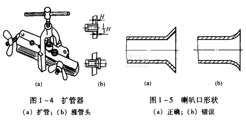 漲喇叭口需要使用專用工具—擴管器,其外形結構如圖1 -4 (a)所示。操作時,將已退火的銅管放入與管徑相同孔徑的夾具的孔中,鋼管露出的高度應為喇叭口深度的1/3,如圖1一4 (b)所示,然后在擴管器的翻邊錐頭上涂冷凍油,旋轉手柄將螺桿旋緊,將錐頭壓緊在管口上,緩慢旋轉螺桿,每轉一下需稍微倒轉一下再旋轉,直到將螺桿旋緊為止。
