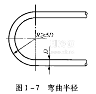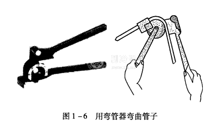 在使用時,不同管徑的管子彎曲要選擇不同規(guī)格的彎管器;為了不使管子彎曲時內(nèi)側(cè)的管壁凹癟,各種管子彎曲半徑應(yīng)不小于管徑的5倍,如圖1一7所示。操作時,把退好火的管子放入彎管器中,用搭扣扣住管子,慢慢旋轉(zhuǎn)柄桿使管子彎曲,當(dāng)管子彎曲到所需角度后,將彎管退出。