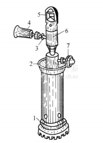 (3)當酒精杯內的酒精接近燒完時,將手輪向左轉,使手輪調節閥稍微松開,讓酒精蒸氣從噴嘴中噴出,并在噴嘴口立即燃燒。由于酒精蒸氣形成高速射流,在噴嘴區內形成低壓區,因此,與旁通孔相連的吸氣管便可吸入周圍空氣,進行檢漏了。