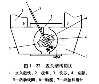 表頭通常是一種高靈敏區(qū)的磁電式直流微安表,其構(gòu)造如圖1 -22所示。在馬蹄形永久磁鐵的磁極間放有導(dǎo)磁能力很強的極掌,它的圓柱孔內(nèi)有純鐵制成的圓柱形鐵芯,極掌與圓柱形鐵芯之間的空隙中放有活動線圈。活動線圈上面固定有軸座,軸座上安裝有軸尖、游絲和指針。當(dāng)活動線圈中有電流通過時,電流產(chǎn)生的磁場與永久磁鐵的磁場相互作用,產(chǎn)生轉(zhuǎn)動力矩,使線圈旋轉(zhuǎn)。線圈轉(zhuǎn)動力矩的大小與通過活動線圈中的電流大小成正比。當(dāng)活動線圈的轉(zhuǎn)動力矩與游絲的反作用力矩相等時,指針就處于平衡狀態(tài),這樣就可以根據(jù)指針?biāo)傅目潭戎苯幼x出被測量的參數(shù)(如電流、電壓、電阻等)的大小。