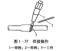 使用銅磷焊料進行焊接時,要盡快地使被焊的鋼管接口處升溫,焊料熔入焊縫的深度應在3~4mm以上,以保證接口處有足夠的強度。焊接操作方法如圖1一37所示。