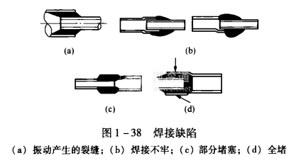 焊接過程中要避免如圖1一38所示的焊接缺陷。焊接時,當焊口的焊料沒有完全凝固時,絕對不可使管口受到振動,否則將會使焊口內產生裂縫,造成滲漏隱患;焊接結束后,必須將焊口處遺留的焊劑清除干凈,以防日后腐蝕管路;在全部焊接工作完成以后,要用高壓氮氣對整個制冷系統進行檢漏,以檢驗焊接質量。