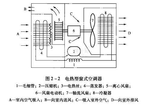 (1)制冷系統。壓縮機吸入來自蒸發器的低溫低壓R22過熱蒸氣,壓縮成高溫高壓過熱蒸氣,送入冷凝器,蒸氣向室外側空氣放出冷凝熱,變成高壓過冷液,經毛細管節流降壓后進入蒸發器,吸收室內側空氣的熱量后變成飽和蒸氣,經回氣管過熱,被壓縮機吸入,如此循環。