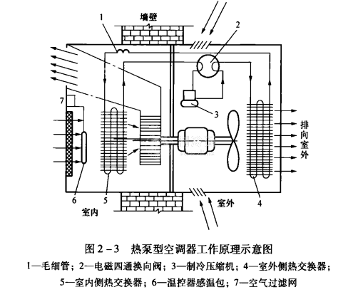 熱泵型窗式空調(diào)器的結(jié)構(gòu)如圖2一3所示,是在單冷型空調(diào)器的基礎(chǔ)上增加了一只電磁換向閥,通過電磁換向閥的作用改變制冷劑流動方向,達到夏天制冷、冬天供暖的目的。