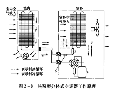 熱泵型分體式空調器工作原理如圖2一8所示,其循環原理與單冷型相同,只是在系統中增加了一個電磁換向閥,用來轉換制冷劑的流向。制冷運行時,從壓縮機出來的高溫高壓氣體排向室外側換熱器,冷凝后經毛細管節流將低溫低壓的R22液體排向室內側,吸收室內熱量;制熱運行時,從壓縮機出來的高溫高壓氣體排向室內側換熱器,使室內溫度升高,而R22在室內被冷凝成液體,經節流后排到室外換熱器,通過吸收室外環境的熱量將液體蒸發成氣體,再進入壓縮機進行下次循環。