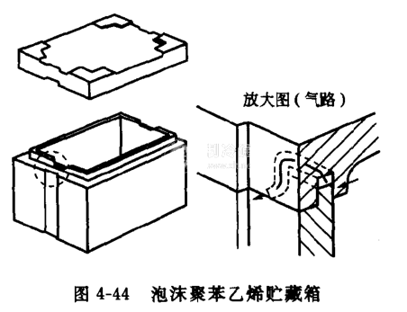 但是這種幾噸重的貯藏箱搬運時,必須使用機械運作。如采用輕便的泡沫聚苯乙烯材料代替鋼材做貯藏箱,不僅搬運方便,而且保溫,耐濕性較好。雖然總體保鮮效果不如前述的鋼材特制PRAC貯藏箱。但是作為短期貯藏還是有較好效果的,而且成本較低。圖4-44是這種泡沫聚苯乙烯貯藏箱的實例。在箱的部分位置開有迷宮狀的孔道,放入果蔬或切花等產(chǎn)品,進行真空冷卻,隨后充入混合氣體到大氣壓,借助于迷宮孔道讓氣體由于濃度差進行擴散,使貯藏箱內(nèi)保持低氧、高二氧化碳的氣調(diào)狀態(tài)。這種把真空冷卻與氣調(diào)貯藏結(jié)合可以短期保持產(chǎn)品的新鮮度,而且貯藏箱輕便,搬運方便,造價低廉。便于推廣應用。