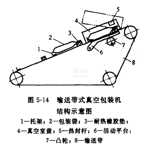 帶式真空包裝機(jī)用輸送帶將包裝袋逐步送入真空室內(nèi)自動(dòng)抽氣并熱封,然后隨輸送帶送出機(jī)外,是一種自動(dòng)化程度和生產(chǎn)效率較高的機(jī)型。圖5-14是輸送帶式真空包裝機(jī)的結(jié)構(gòu)示意圖,包裝袋置于輸送帶的托架1上,隨輸送帶進(jìn)入真空室蓋4位置停止,室蓋4自動(dòng)放下,活動(dòng)平臺(tái)6在凸輪7作用下抬起,與真空室蓋構(gòu)成密閉真空室,隨后進(jìn)行抽真空和熱封操作;操作完畢,活動(dòng)平臺(tái)降下而真空室蓋升起,輸送帶步進(jìn)將包裝袋送出機(jī)外。該機(jī)型的真空系統(tǒng)、熱封原理與室式真空充氣包裝機(jī)相同。要實(shí)現(xiàn)充氣操作,也與圖5-12室式真空充氣包裝機(jī)一樣,只需要將氣源的翰出軟管,接入真空室內(nèi),當(dāng)包裝袋抽完真空,就對(duì)袋內(nèi)充入所需氣體并熱封封口。就可完成抽真空一充氣一熱封操作。但包裝機(jī)一定要配置氣體動(dòng)態(tài)比例混合器供氣。