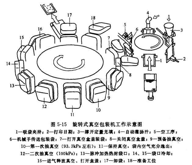 圖5-15是旋轉式真空包裝機工作示意圖,該機由充填和抽真空兩個轉臺組成,兩轉臺之間裝有機械手自動將已充填物料的包裝袋送入抽真空轉臺的真空室。充填轉臺有6個工位,自動完成供袋、打印、張袋、充填固體物料、注射湯汁5個動作;抽真空轉臺有12個單獨的真空室,包裝袋在旋轉一周經過12個工位完成抽真空、熱封、冷卻到卸袋的動作,機器的生產能力達到40袋/min。由于機器的生產能力較高,國外機型配套定量杯式充填裝置,預先將固體物料稱量