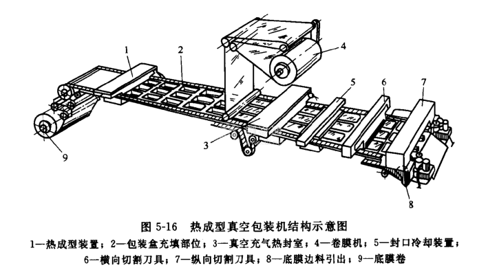 熱成型真空包裝機供塑料盒式真空包裝,圖5-16是該型機的結構示意圖。機器的工作過程為:底膜從膜卷9被輸送鏈夾持步進送入機內,在熱成型裝置1加熱軟化并拉伸成盒型;成型盒在充填部位2充填包裝物,然后被從膜卷4引出的蓋膜搜蓋,進入真空室3實施抽真空一充氣,再熱封;完成熱封的盒帶步進經封口冷卻裝置5、橫向切割刀6和縱向切割刀7將數排塑料盒分割成單件送出機外,同時底膜兩側邊料脫離輸送鏈送出機外卷收。