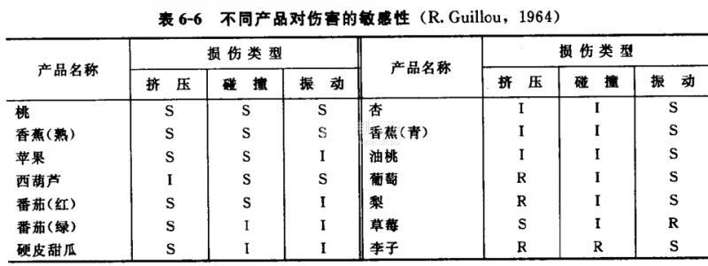 各種果蔬對物理傷害的承受能力不同,下面介紹一些果蔬對三種類型機械傷害的敏感值,見表6-6,以便選擇不同的包裝來保護(hù)產(chǎn)品,防止果蔬在貯藏、運輸、銷售過程中,受擠壓、碰撞、擦傷和振動。