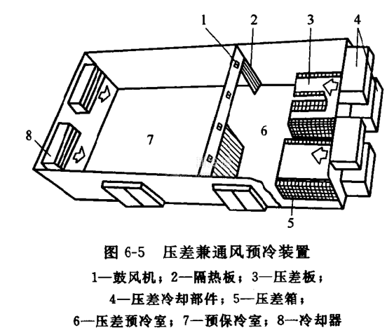 圖6-5為壓差兼通風預冷裝置,它是由面積為63㎡的壓差預冷室和面積為108㎡的保冷室組成。壓差預冷室白天作為冷藏庫,夜間作為通風預冷庫使用。