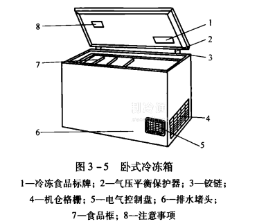 臥式冷凍箱如圖3一5所示,有效容積為200~550L,箱內溫度低于-18℃,溫度單一主要用于冷凍食品與冷凍食品儲存。它具有深冷速凍、冷凍能力大、結構簡單、價格較低等特點.適用于肉類、魚類食品冷凍與儲存。