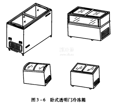 臥式透明門冷凍箱如圖3一6所示,一般有效容積為500L以下,箱內溫度低于-15℃,溫度單一,只有冷凍及冷藏功能。其外形美觀豪華,透明玻璃門柜內冷藏食品、飲料等一目了然,結構較簡單,價格較低。