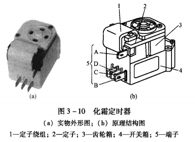 化霜定時器如圖3-10所示,由轉動部分(定子、定子繞組、轉子帶動齒輪減速箱)和開關部分(凸輪、接點板、凸輪連接部)組成。通電后,電動機使齒輪轉動,經過凸輪作間隙運動,每32min旋轉240°。