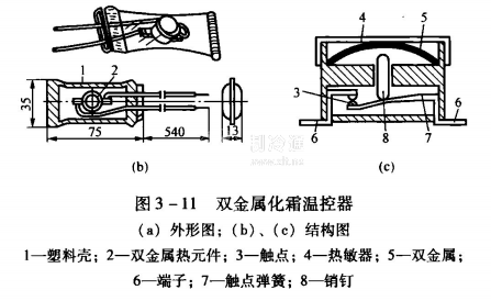 雙金屬化霜溫控器如圖3一11所示,是利用雙金屬片在不同溫度下的變形而產生動作的雙金屬,其外殼的金屬面作為熱敏部位,在-5℃以下時,雙金屬片不接觸銷釘,接點接通電熱器的電源,當蒸發器表面溫度達到13℃時雙金屬片變形,將壓銷釘向下壓,使接點斷開,切斷加熱器的電源。