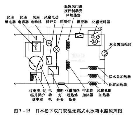 電路的工作原理為:電路接通電源后,當(dāng)溫控器觸點(diǎn)接通,化霜定時(shí)器觸點(diǎn)①與觸點(diǎn)③接通時(shí),壓縮機(jī)的起動(dòng)與保護(hù)電路通過電流,壓縮機(jī)開始運(yùn)轉(zhuǎn),電冰箱開始制冷。同時(shí)化霜定時(shí)器的時(shí)鐘電動(dòng)機(jī)M、化霜加熱器和化霜超熱保護(hù)器也有電流通過,雖然化霜定時(shí)器時(shí)鐘電機(jī)M與化霜加熱器串聯(lián)在電路中,但是由于化霜定時(shí)器時(shí)鐘電動(dòng)機(jī)M的內(nèi)阻遠(yuǎn)大于化箱加熱器、接水盤加熱器、排水管加熱器和風(fēng)扇口圈加熱器的并聯(lián)電阻,因此在電路制冷運(yùn)行過程中,并聯(lián)后的加熱器并不工作,而化霜定時(shí)器的時(shí)鐘電動(dòng)機(jī)M與壓縮機(jī)電動(dòng)機(jī)同步運(yùn)行進(jìn)行計(jì)時(shí)。