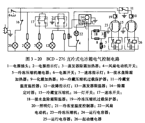 BCD一276型電冰箱采用雙壓縮機制冷系統(tǒng),冷藏室、冷凍室各有一套控制系統(tǒng),其冷藏室的控制方法與一般直冷式電冰箱相同。其冷凍室控制電路如圖3-20所示。
