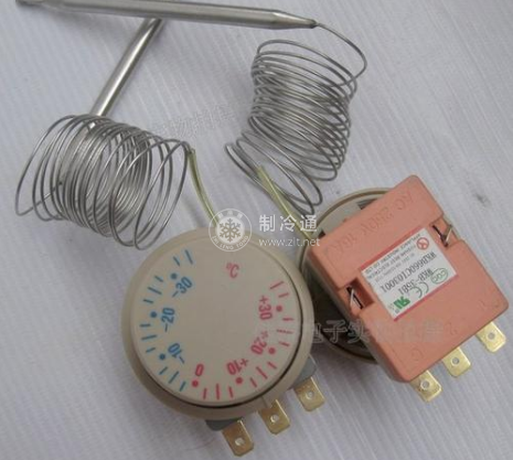 (2)機械式溫度控制器好壞的簡易判斷方法。將懷疑有故障的溫控器從箱中拆出,把溫控器調節桿旋轉至正常位置,用萬用表Rx1擋測溫控器兩個主觸點間的阻值,正常的阻值應為零或1~2Ω左右。若阻值無窮大,則說明感溫元件內的感溫劑已泄漏光了;若阻值在10Ω以上,則說觸點間已嚴重積炭。
