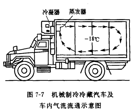 機械制冷冷藏汽車的蒸發器通常安裝在車廂的前端,采用強制通風方式,如圖7-7所示。冷風沿車廂頂部向后流動,從兩側及車廂后部下到車廂底面,沿底面間隙返回車廂前端。這種通風方式使整個產品貨堆都被冷空氣包圍,外界傳入車廂的少量熱流直接被冷風吸收,不致影響產品的溫度。制冷機組的制冷能力為8 374-12 560kJ/h,可保持凍結食品的溫度在一18℃以下。
