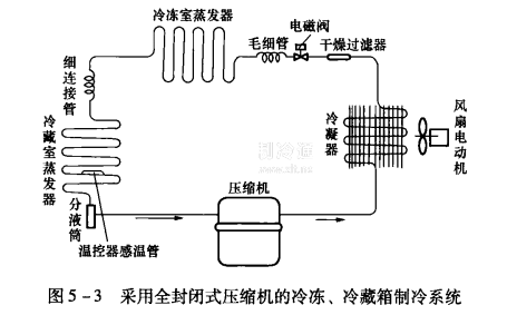圖5一3所示為采用全封閉式壓縮機的冷凍、冷藏箱制冷系統。機組由全封閉式壓縮機、冷凝器、電磁閥、干燥過濾器、毛細管、蒸發器、分液筒等組成。
