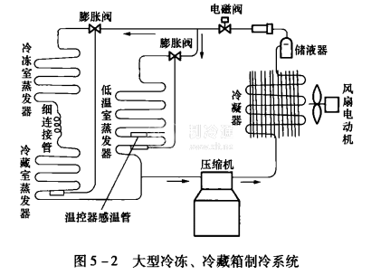 冷凍、冷藏箱制冷系統主要由制冷壓縮機、風冷式冷凝器、儲液器、電磁閥、干燥過濾器、膨脹閥、毛細管、蒸發器等組成。圖5 -2所示為采用開啟式壓縮機組的大型冷凍、冷藏箱制冷系統。