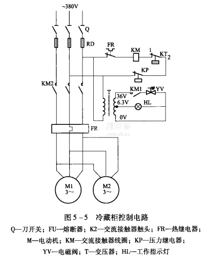 圖5 -5是一種自動控溫的冷藏柜控制電路。冷藏柜內溫度的控制由溫度控制器自動調節。圖中標出的1和2是溫度繼電器KT接線端子的標號,常溫時為閉合觸點,降溫達到預定值觸點斷開。