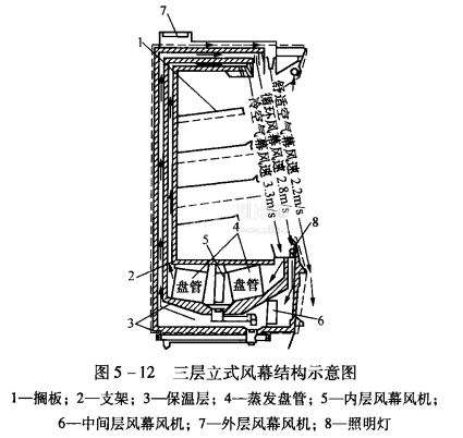 圖5一12為三層立式風幕的結構示意圖。外層風幕是不經過蒸發器的循環風幕,主要起隔絕內外空氣的作用,所以又稱為舒適空氣幕,空氣直接來自環境,外層風幕風道長、阻力大、風速低,以減少對外界空氣的卷吸和內層冷空氣的外溢內層為經過蒸發器的冷空氣幕,風幕的風道短、阻力小、風速高,以增強對柜內商品的冷卻和防止柜內冷量的外溢。中間層為柜內空氣循環風幕。