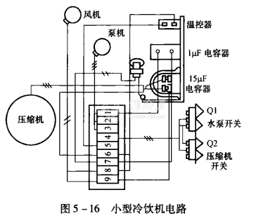 圖5一16所示為國產單缸噴泉式冷飲機的電氣控制圖。在冷飲機工作時,當水溫降至事先調定的溫度時,溫控器的觸點動作,斷開電路,壓縮機即停止運轉。