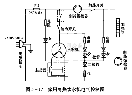 圖5一17所示為家用冷熱飲水機的電氣控制圖。該飲水機用制冷開關和加熱開關分別起動冷水和熱水,如冬季不需要冷飲時,可關閉制冷開關,起動加熱開關。