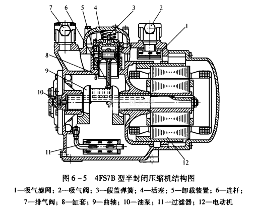 小型冷藏庫(kù)使用的壓縮機(jī),一般多為半封閉或全封閉壓縮機(jī)。冷藏能力在50t以上時(shí)多使用半封閉壓縮機(jī)。現(xiàn)以如圖6一5所示的4FS7B型半封閉壓縮機(jī)結(jié)構(gòu)圖為例,看一下半封閉壓縮機(jī)的基本結(jié)構(gòu)。