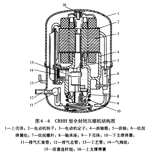 半封閉壓縮機(jī)的特點(diǎn)是所有部件全部密封在機(jī)殼內(nèi),為保證運(yùn)轉(zhuǎn)時(shí)潤(rùn)滑油的供應(yīng),采用轉(zhuǎn)子式內(nèi)嚙合齒輪油泵供油。 圖6-6所示為小型冷藏庫(kù)使用的CRHH型全封閉壓縮機(jī)結(jié)構(gòu)圖,廣泛用于冷藏能力在50t以下的小型冷藏庫(kù)。