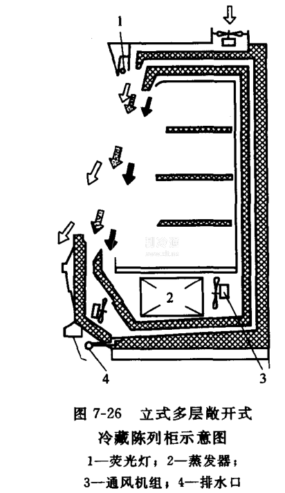 圖7-26為立式多層敞開式冷藏陳列柜示意圖。與臥式的相比,立式多層陳列柜單位占地面積的容積大,商品放置高度與人體高度相近,展示效果好,也便于顧客購物。但這種結(jié)構(gòu)的陳列柜,其內(nèi)部的冷空氣更易逸出柜外,從而外界侵入的空氣量也多,為了防止冷空氣與外界空氣的混合,在冷風幕的外側(cè),再設置一層或兩層非冷空氣構(gòu)成的空氣幕,同時,配備了較大的制冷能力和冷風量。由于立式陳列柜的風幕是垂直的,外界空氣侵入柜內(nèi)的數(shù)量受空氣流速的影響更大,從節(jié)能的角度來看,要求控制柜外風速小于0. 15m/s以下,溫度低于25℃濕度低于55%。