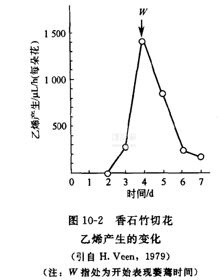 花在開放的過程中,伴隨著乙烯的生成。如香石竹,花剛開放時,乙烯的生成量極少,并在幾天之內保持穩定,在花衰老萎蔫之前,乙烯的生成量出現一個躍變高峰,產量達到初花期的幾百倍,此后開始出現衰敗癥狀。隨著花的衰老,乙烯的產生量又急劇下降。圖10-2為香石竹切花乙烯產生的三個階段。香石竹切花采后僅產生少量乙烯,采后幾天出現一個高峰,這剛好在花瓣開始萎蔫之前。香石竹花的乙烯主要產自花柱和花瓣?;ò甑幕勘然ò甑纳喜慨a生乙烯較早,數量較大?;ǘ涫诜劭纱碳て湟蚁┊a生,加快花瓣的萎蔫和衰敗。授粉之后,花瓣就開始萎蔫,此后所有花器均出現乙烯釋放高峰,衰老過程加速,許多切花都有同樣的乙烯生成模式。