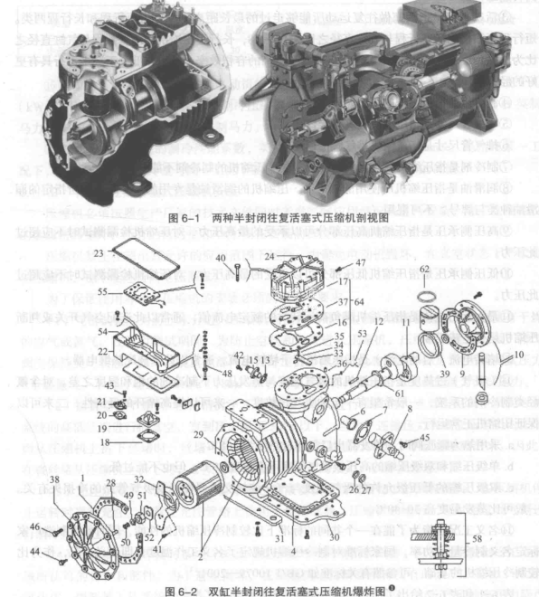 半封閉往復(fù)活塞式壓縮機(jī)主要由電動(dòng)機(jī)、曲軸、連桿、活塞、閥板、吸氣閥片、排氣閥片、吸氣閥、排氣閥等部件組成(圖6-1,圖6-2)。所有部件都被密封在機(jī)殼內(nèi).由電動(dòng)機(jī)提供動(dòng)力。曲軸和連桿將電動(dòng)機(jī)的旋轉(zhuǎn)運(yùn)動(dòng)轉(zhuǎn)變?yōu)橥鶑?fù)運(yùn)動(dòng),由連桿帶動(dòng)活塞在氣缸內(nèi)做往復(fù)運(yùn)動(dòng),實(shí)現(xiàn)吸氣、壓縮、排氣、膨脹各個(gè)工作過(guò)程。通過(guò)氣閥控制氣體的流進(jìn)、流出。壓縮機(jī)殼體內(nèi)設(shè)有油池儲(chǔ)存潤(rùn)滑油,通過(guò)潤(rùn)滑機(jī)構(gòu)來(lái)滿足機(jī)械部件之間進(jìn)行相對(duì)運(yùn)動(dòng)時(shí)的潤(rùn)滑需要。