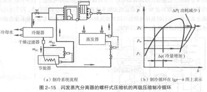 以帶閃發蒸汽分離器的螺桿式壓縮機的制冷循環為例(圖2-15)。