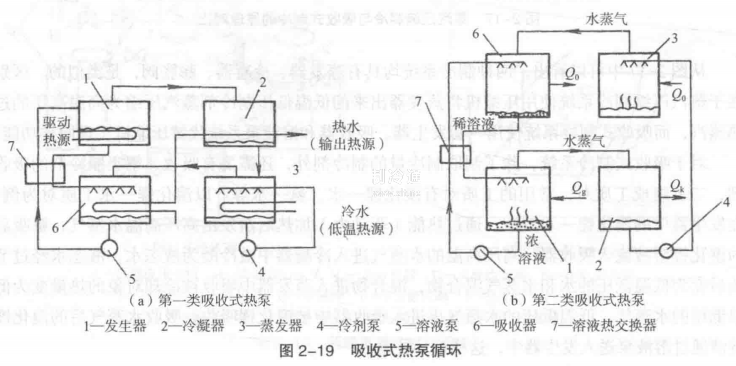 吸收式制冷是除蒸汽壓縮制冷外應用較多的一種制冷方式,它也是利用制冷劑在蒸發器中蒸發吸熱實現制冷的目的。但吸收式制冷不使用壓縮機,以發生器、吸收器替代。其最大特點是主要利用熱能馭動系統運轉制冷。因此,在余熱、廢熱利用方面具有獨有的優勢。當然,也可以采用一次能源如天然氣、燃油直接燃燒加熱驅動。與蒸汽壓縮制冷類似,吸收式制冷循環也可用于制熱(熱泵)。吸收式熱泵循環。吸收式熱泵分為增熱型(第一類)和升溫型(第二類)兩大類,圖2-19為其原理圖。