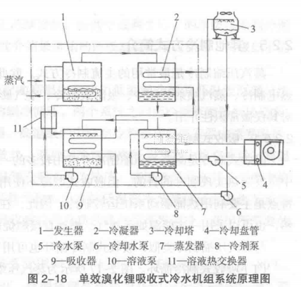 圖2-18所示為蒸汽型單效溴化鋰吸收式冷水機組系統原理。系統由制冷劑回路、吸收劑回路、熱源回路、冷卻水回路和冷凍水回路組成。圖中未標出各回路的全部部件。