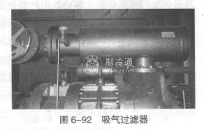 壓縮機運行后,系統內的雜質會被吸入壓縮機,為此設置了吸氣過濾器(圖6-92)。它是由焊接殼體和不銹鋼絲過濾網膽組成。如果吸氣濾網發生堵塞。會導致吸氣壓力低,過濾網前后壓差大,為此設置吸氣壓差大保護,設定仇一般為0.1MPa。當壓縮機發出吸氣壓差大保護時要注意清洗吸氣過濾網。清洗方法與清洗油濾網類同。