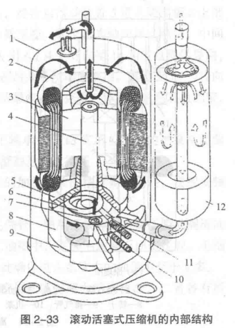 2-33是一臺立式、單缸、全封閉滾動活塞式壓縮機的內部結構圖。在圓筒形封閉殼體1內,安裝著上部是電動機、下部是壓縮機的機組。電動機由定子2和轉子3組成。電動機的定子與封閉殼體內壁緊貼。轉子內孔與壓縮機的曲軸4成緊配合連接。壓縮機主要由氣缸8、滾動活塞(亦稱滾套)6、滑片11、滑片彈簧10、上氣缸蓋5和下氣缸蓋9及排氣閥7組成。上、下氣缸蓋又稱主軸承和副軸承。在壓縮機封閉殼體的下部盛有潤滑油。通過偏心軸上的油孔,潤滑油分別流至滾動活塞內壁、主軸承和副軸承中進行潤滑。