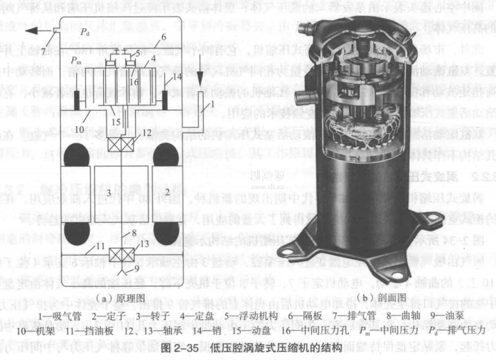 圖2-35所示為一種典型的低壓腔渦旋式壓縮機(jī)的結(jié)構(gòu)示意圖(不考慮保護(hù)裝置)。回氣由殼體上的吸氣管1進(jìn)入殼體,冷卻電動(dòng)機(jī)定子2、轉(zhuǎn)子3后由定盤4上的吸氣口進(jìn)入壓縮腔)高壓氣體由定盤上部中央的排氣口排出,經(jīng)密封浮動(dòng)裝置5進(jìn)入隔離板6上部的高壓空間,最后由排氣管7排出。整個(gè)殼體下部為低壓腔。其定盤為軸向浮動(dòng)結(jié)構(gòu),中間壓力腔位于定盤上方飛,壓力由定盤上的中間壓力孔16引入,4個(gè)導(dǎo)向銷14為定盤提供導(dǎo)向,中間壓力使定盤產(chǎn)生向機(jī)架運(yùn)動(dòng)的趨勢(shì)于以保證端面密封并補(bǔ)償端面磨損。其動(dòng)盤15為徑向柔性結(jié)構(gòu),曲軸偏心在一定范圍內(nèi)可自動(dòng)調(diào)節(jié),動(dòng)盤依靠離心力克服氣體壓力緊貼定盤側(cè)壁,保證密封并起柔性補(bǔ)償作用。
