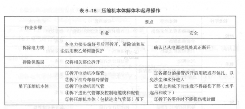 在解體檢查壓縮機(jī)之前應(yīng)確認(rèn)壓縮機(jī)內(nèi)部壓力完全泄盡,確保所有電源都全部斷開。壓縮機(jī)本體解體和起吊作業(yè)操作步驟見表6-18。壓縮機(jī)本體從蒸發(fā)器和冷凝器上吊下時(shí),應(yīng)按扁擔(dān)方式起吊。