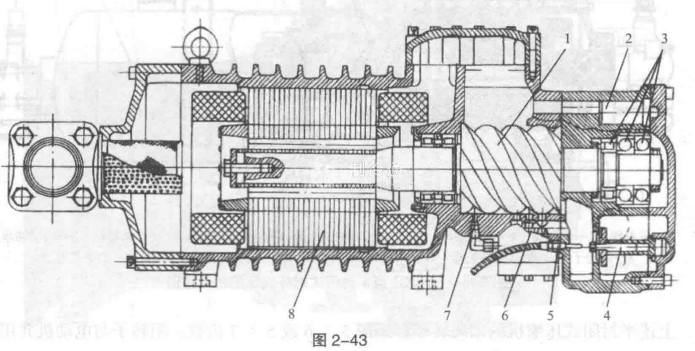 圖2-43和圖2-44是典型單級半封閉式螺桿式壓縮機的結構圖。