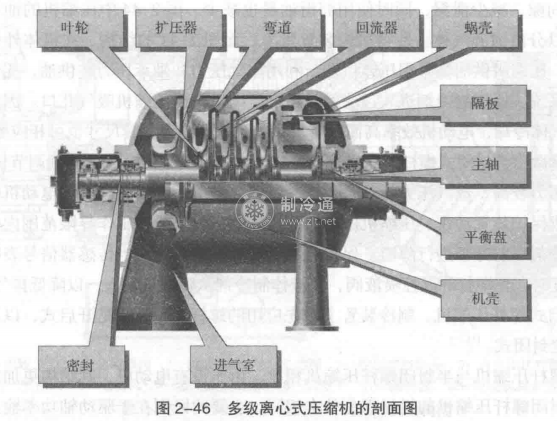 圖2-45所示為單級離心式制冷壓縮機的剖面圖,圖2-46所示為多級離心式壓縮機的剖面圖。