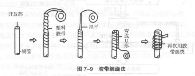 管口的密封可根據施工場所及工期采用“夾扁法”或“膠帶纏繞法”。夾扁法是將銅管一端夾扁閉塞、縫隙用釬焊封閉的處理方法,用于長期放置或放置在惡劣環境的配管。膠帶纏繞法是用膠帶纏繞封閉管口的處理方法,適用于短期或室內放置的配管(圖7-9)。